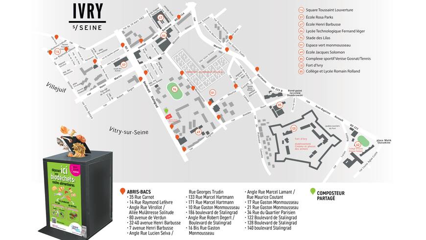 Des abris-bacs de collecte des déchets alimentaires sont installés sur l’espace public dans le quartier Monmousseau-Vérollot depuis mai 2024, et dans le quartier Marat-Parmentier courant janvier 2025. Depuis septembre 2025, le dispositif s'est également élargi au quartier Petit-Ivry.