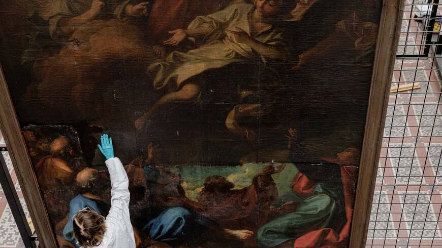 Cette huile sur toile, de 3,60 m par 2,45 m, a été déménagée dans l’atelier-réserve du service de la Coarc (Conservation des œuvres d'art religieuses et civiles) de la Ville de Paris, avec son aimable acceptation. Un lieu fermé, situé quelque part à Ivry, que nous avons eu la chance de découvrir. faire lien vers actu sur la réserve. Cet atelier, est dédié à recevoir des grands formats. L’œuvre a été accrochée sur une grille monumentale afin de permettre aux restaurateurs Marie Parant et Emmanuel Joyerot, mandatés par la Ville d’Ivry, de lui refaire une beauté.