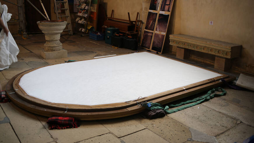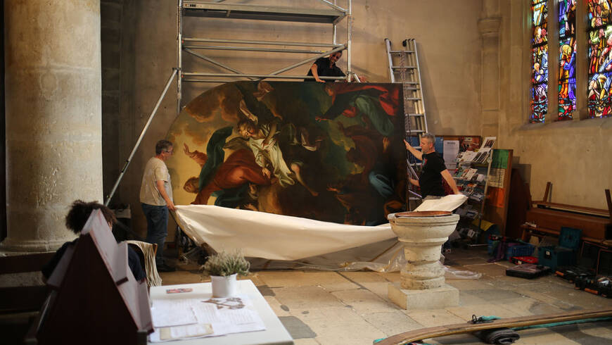 « Pendant sa restauration, ce grand format a été accueilli gracieusement dans l’atelier-réserve du service de la Coarc [Conservation des œuvres d'art religieuses et civiles] de la Ville de Paris, situé à Ivry, » précise Hedi Saïdi, responsable du service arts plastiques à la direction municipale de la culture, qui a supervisé ce chantier.