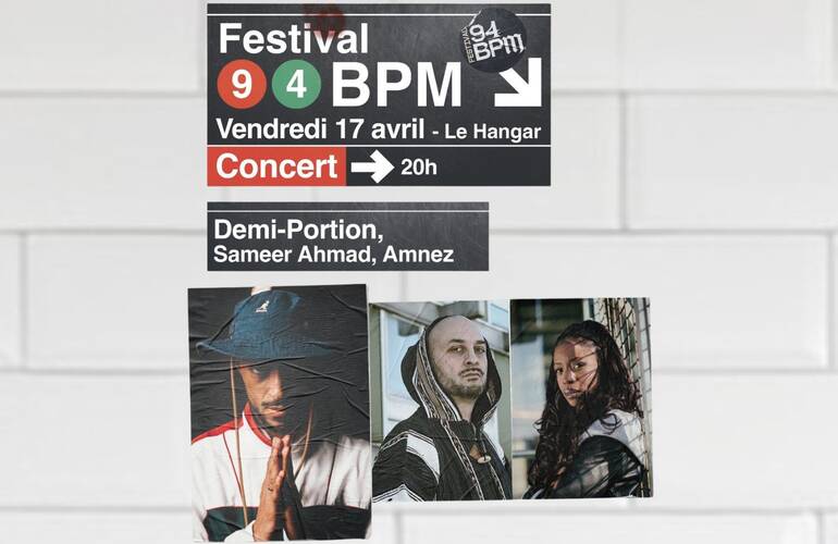 ConcertFESTIVAL 94 BPM : DEMI PORTION, SAMEER, AHMAD AMNEZDu 17 au 19 avril, Le Festival 94 BPM fait son grand retour avec concerts, débats et projections en plein cœur d’Ivry ! Le 17 avril 2026Le Hangar