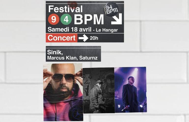 ConcertFESTIVAL 94 BPM : SINIK, SATURNZ, MARCUS KLAN Du 17 au 19 avril, Le Festival 94 BPM fait son grand retour avec concerts, débats et projections en plein cœur d’Ivry ! Le 18 avril 2026Le Hangar