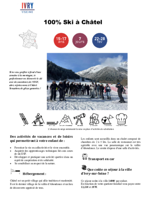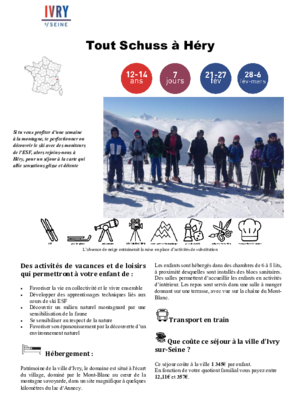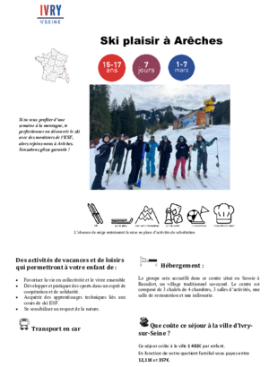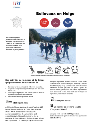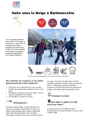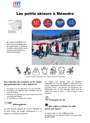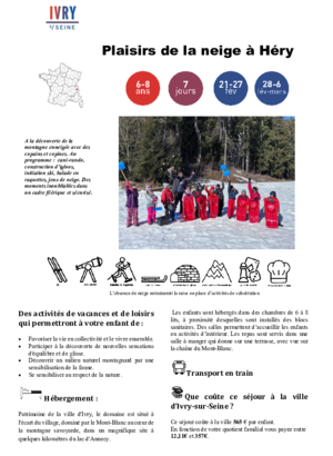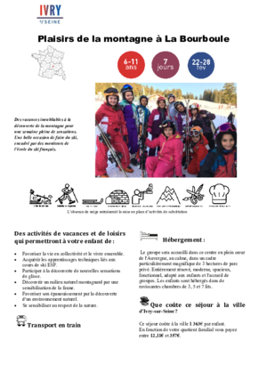 Écouter cette pageSéjour pour les 5-6 ans (Enfants scolarisés en maternelle)LA BOURBOULE bambino 5/6 ANS PDF 342 KoTéléchargerSéjours pour les 6-11 ans plaisir de la neige à héry 6/8 ans PDF 496 KoTéléchargerplaisir de la montagne à la Bourboule 6/11 ans PDF 341 KoTéléchargerles petis skieurs à méaudre 6/11 ans PDF 467 KoTéléchargerski partie à héry 9/11 ansPDF 367 KoTéléchargerSéjours pour les 12-14 ans tout schuss à héry 12/14 ans PDF 337 KoTéléchargerbellevaux en neige 12/14 ans PDF 398 KoTéléchargerski à la plagne 12/14 ans PDF 402 KoTéléchargerSéjours pour les 15-17ansITALIE SOUS LA NEIGE à BARDONECCHIA 15/17 ANS PDF 371 KoTéléchargerSENSATION GLISSE à CHAMONIX 15/17 ANS PDF 391 KoTéléchargerSki plaisir à ArêchePDF 418 KoTélécharger100% Ski à ChatelPDF 410 KoTélécharger
