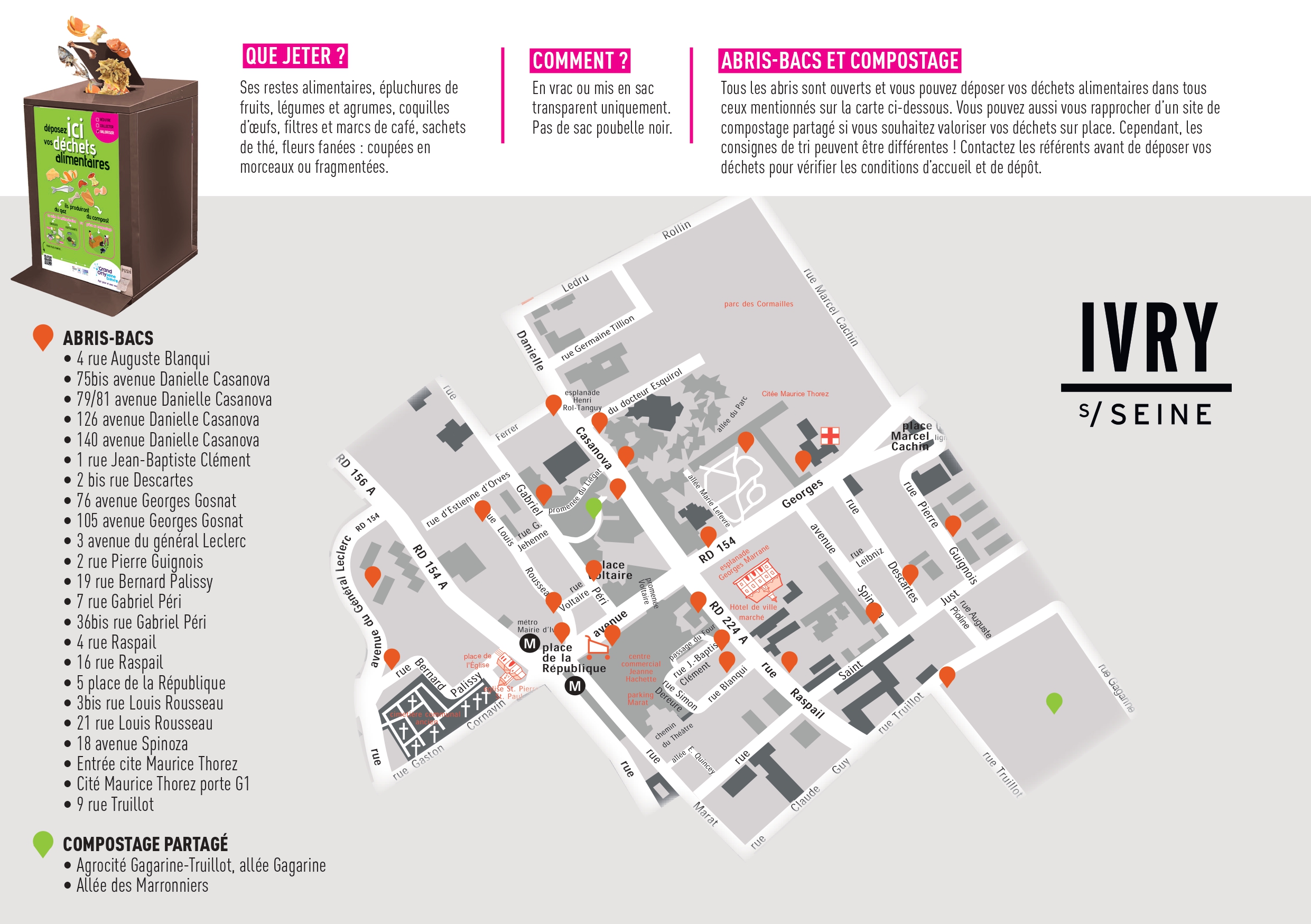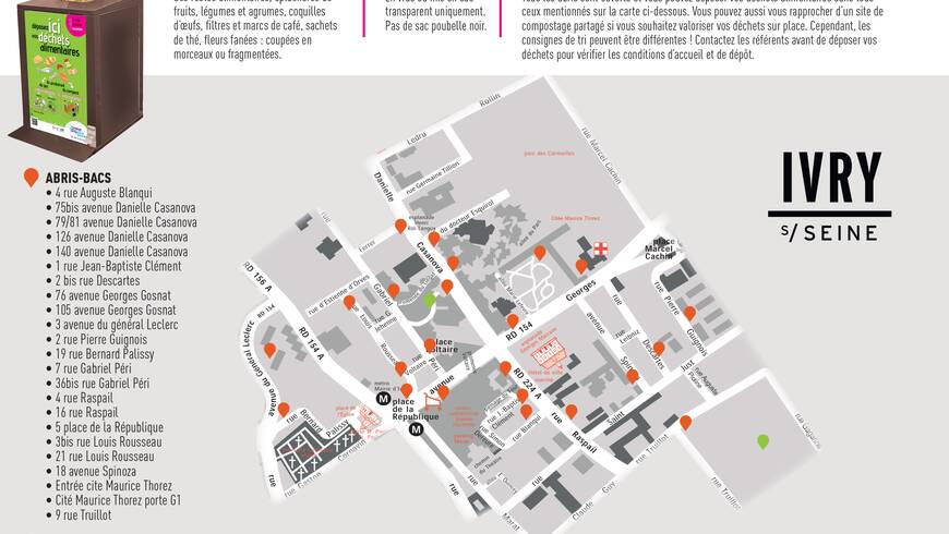 Des abris-bacs de collecte des déchets alimentaires sont installés sur l’espace public dans le quartier Monmousseau-Vérollot depuis mai 2024, et dans le quartier Marat-Parmentier courant janvier 2025. Depuis septembre 2025, le dispositif s'est également élargi au quartier Petit-Ivry. Enfin, le dispositif va être mis en place dans le quartier Centre-Ville courant décembre 2025.
