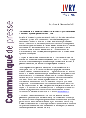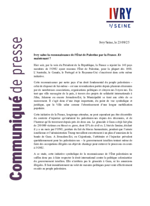 Écouter cette pageCommuniqués de presse et lettres de l'année 2025Nouvelle étude de la fondation Toxicowatch - 24/09/2025PDF 213 KoTéléchargerReconnaissance de l’État de Palestine par la France - 23/09/2025PDF 198 KoTéléchargerBanderole en soutien au peuple palestinien - 02/09/2025PDF 142 KoTéléchargerBanderole en soutien au peuple palestinien - 22/08/2025PDF 299 KoTéléchargerL'US Ivry Handball devient une SCIC - 11/04/25PDF 332 KoTéléchargerLa Ville et le maire mettent un terme à l’usage du réseau social X 31/03/25PDF 271 KoTéléchargerIncendie du Gymnase Delaune - 25/02/2025PDF 52 KoTélécharger